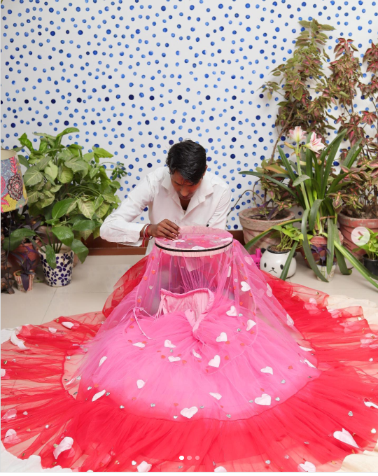 Every cut, stitch and embroidery is done by our 'karigar'. Handicraft is a heritage of our country which lives in our heart and we aim to promote and revive the craft. We build the garments that are a perfect blend of the craft with contemporary fashion. Sustainability is our main focus through the process. Using industrial waste material and creating a different designs with it. Blushing Couture provides a safe environment for our artisans to empower their creative side and assemble wonderful designs for our clients.