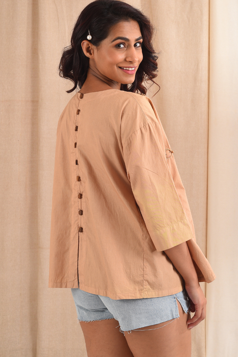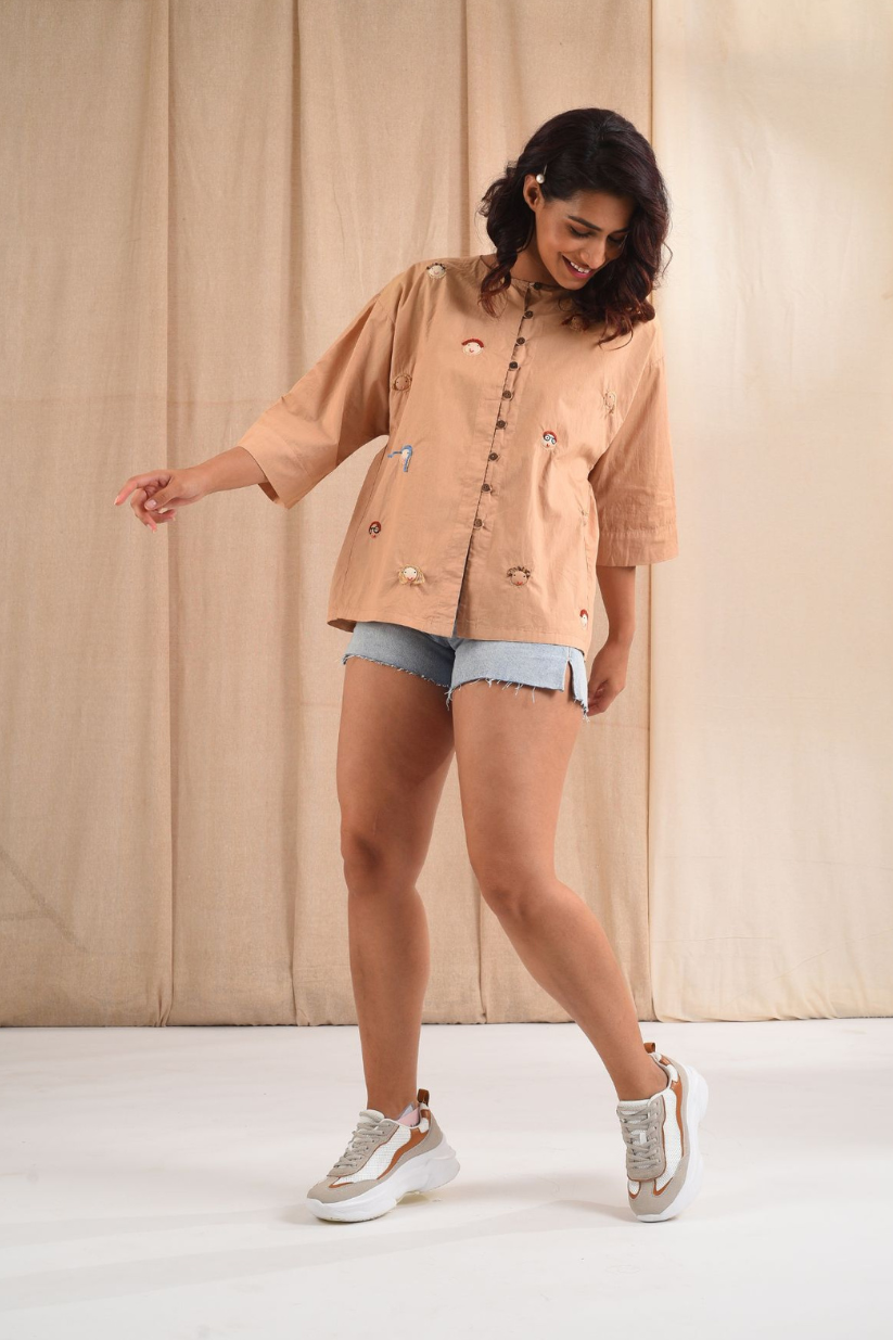 100% cotton shirt with back placket and side panel detail with fully hand crafted puppet embroidery .
