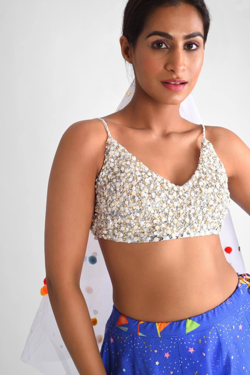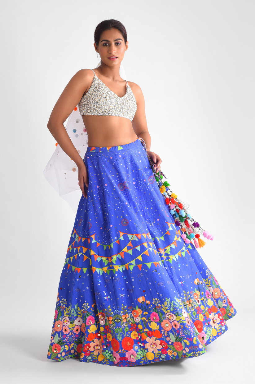 Our blue Lehanga is a dreamy outfit for sangeet and mehandi function From stars to galaxies, buntings to florals and so many cute elements are printed and highlighted with beautiful hand embroidery The blouse is nothing less then a piece of art for making you look gorgeous. A perfect outfit for your sangeet or mehandi function