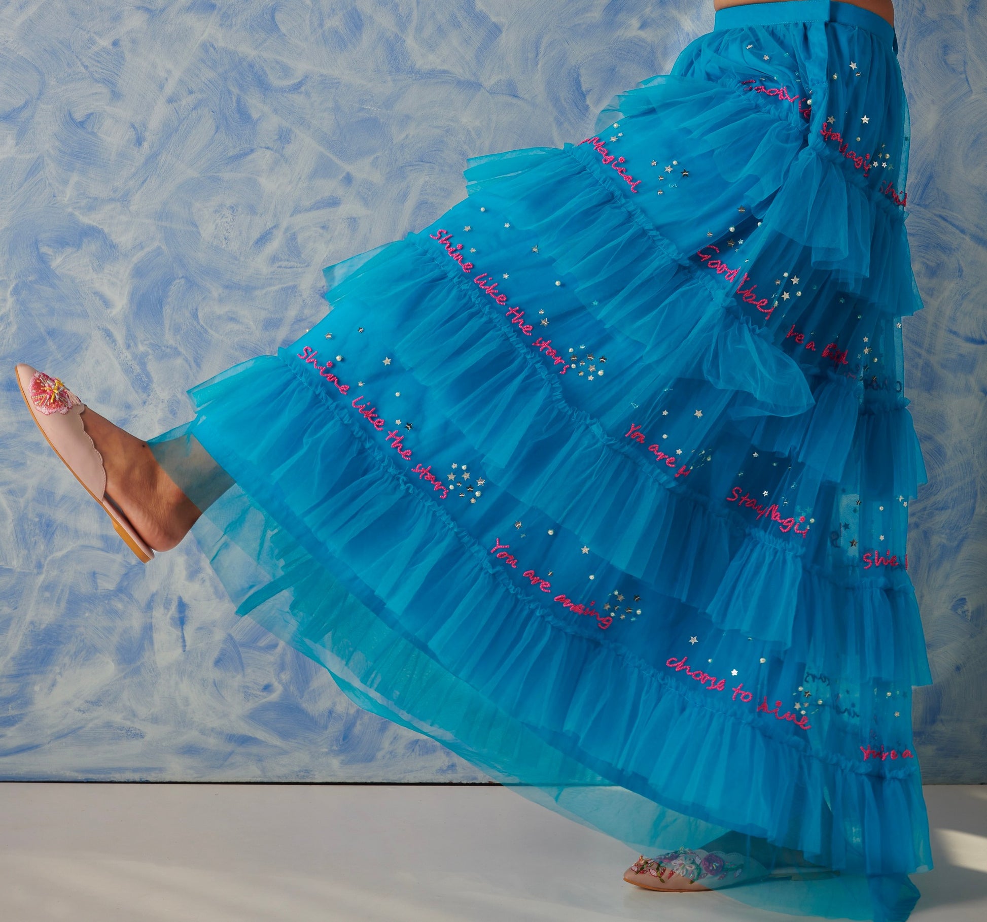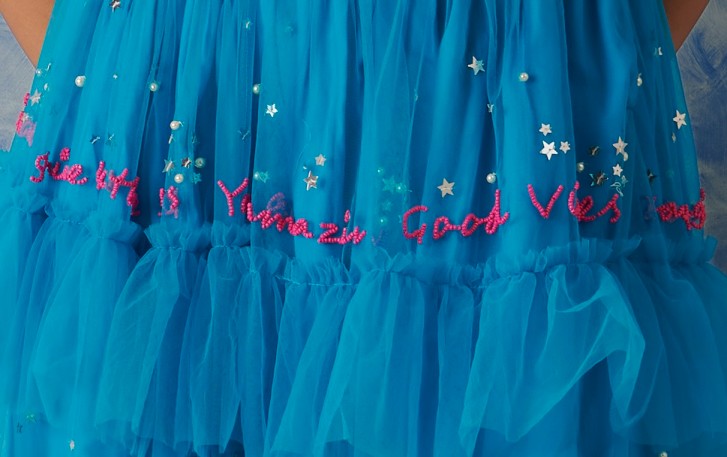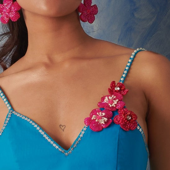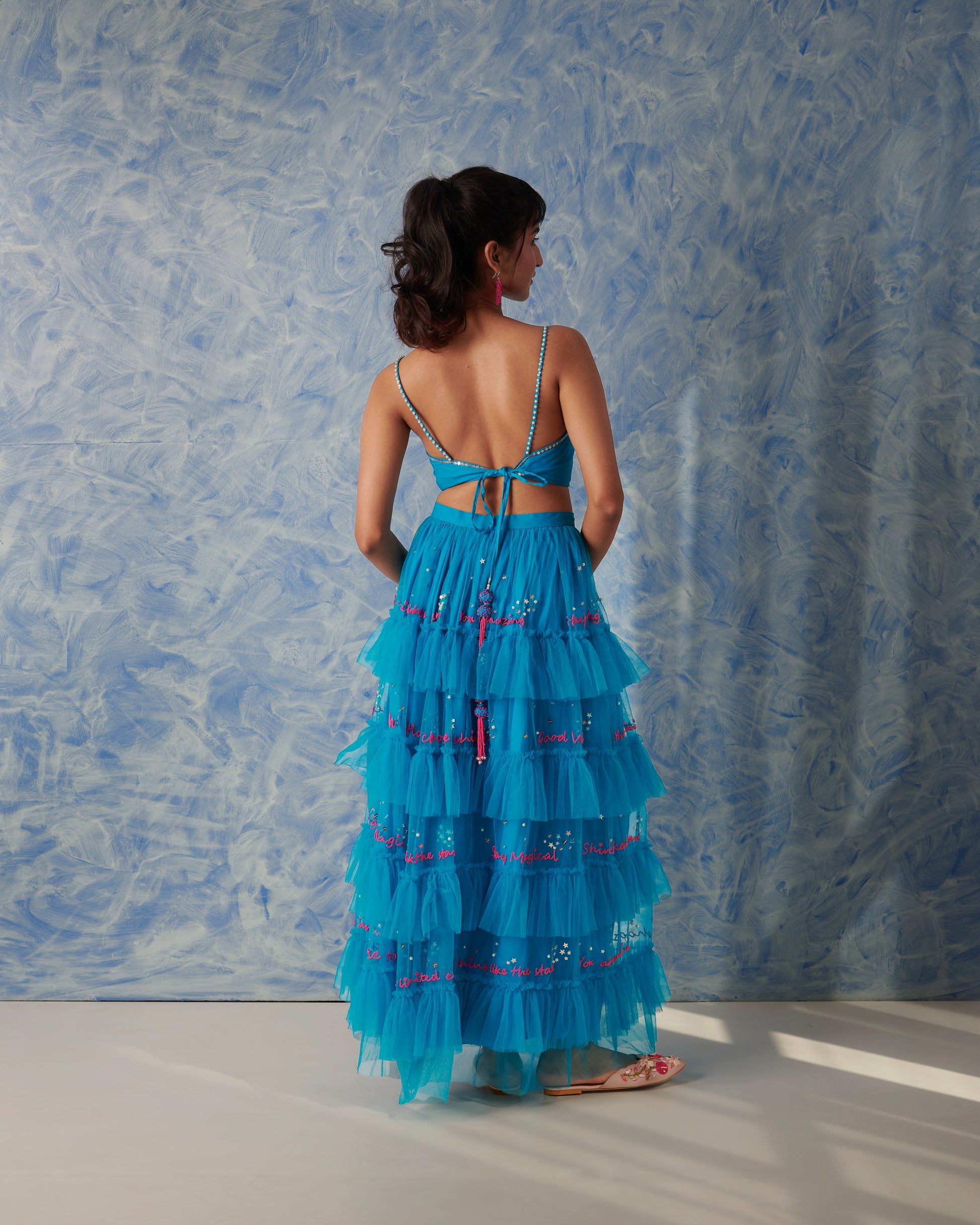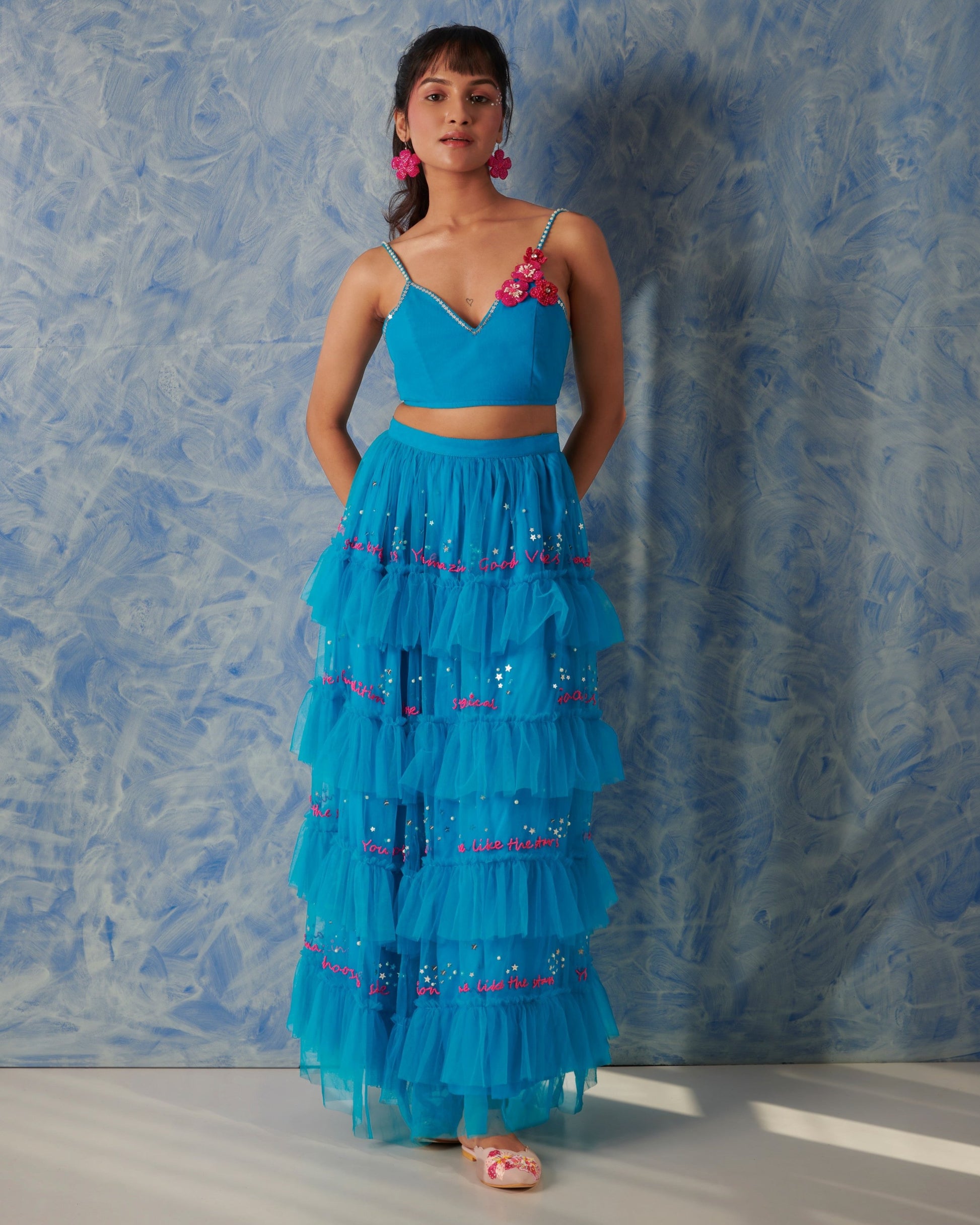 A happy ensemble for beach weddings or a fashion event. This gorgeous skirt is all over hand embroidered write-up wit.h hot pink glass beads and highlights of stars and galaxies all over. It comes with this a back tie up blouse which is highlighted with handmade flowers and tassels. A perfect outfit to dance all night in full comfort.