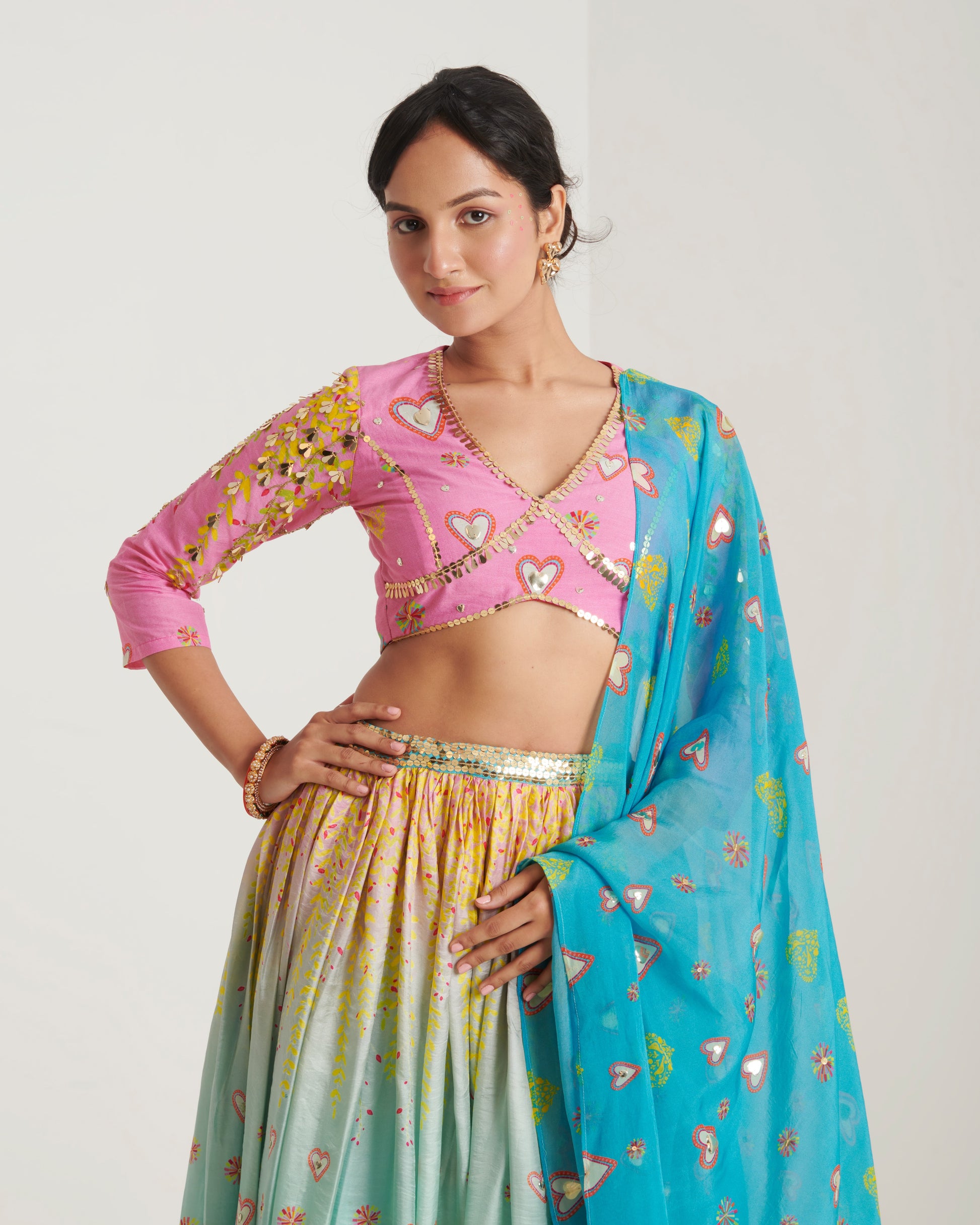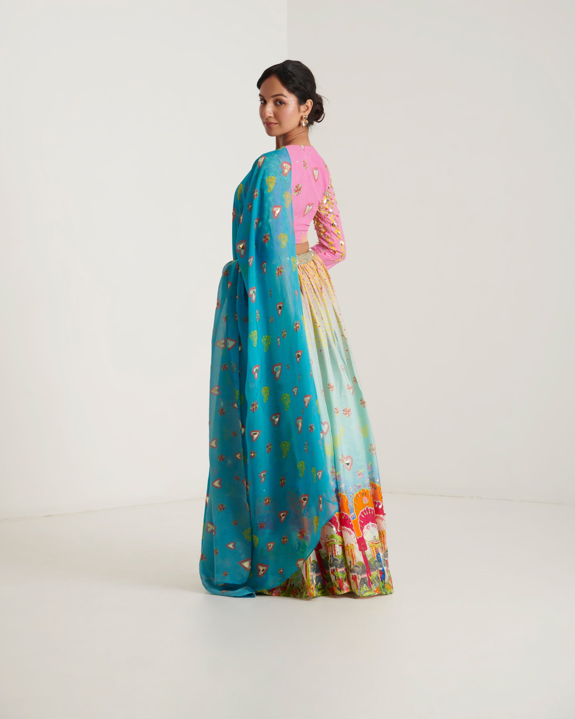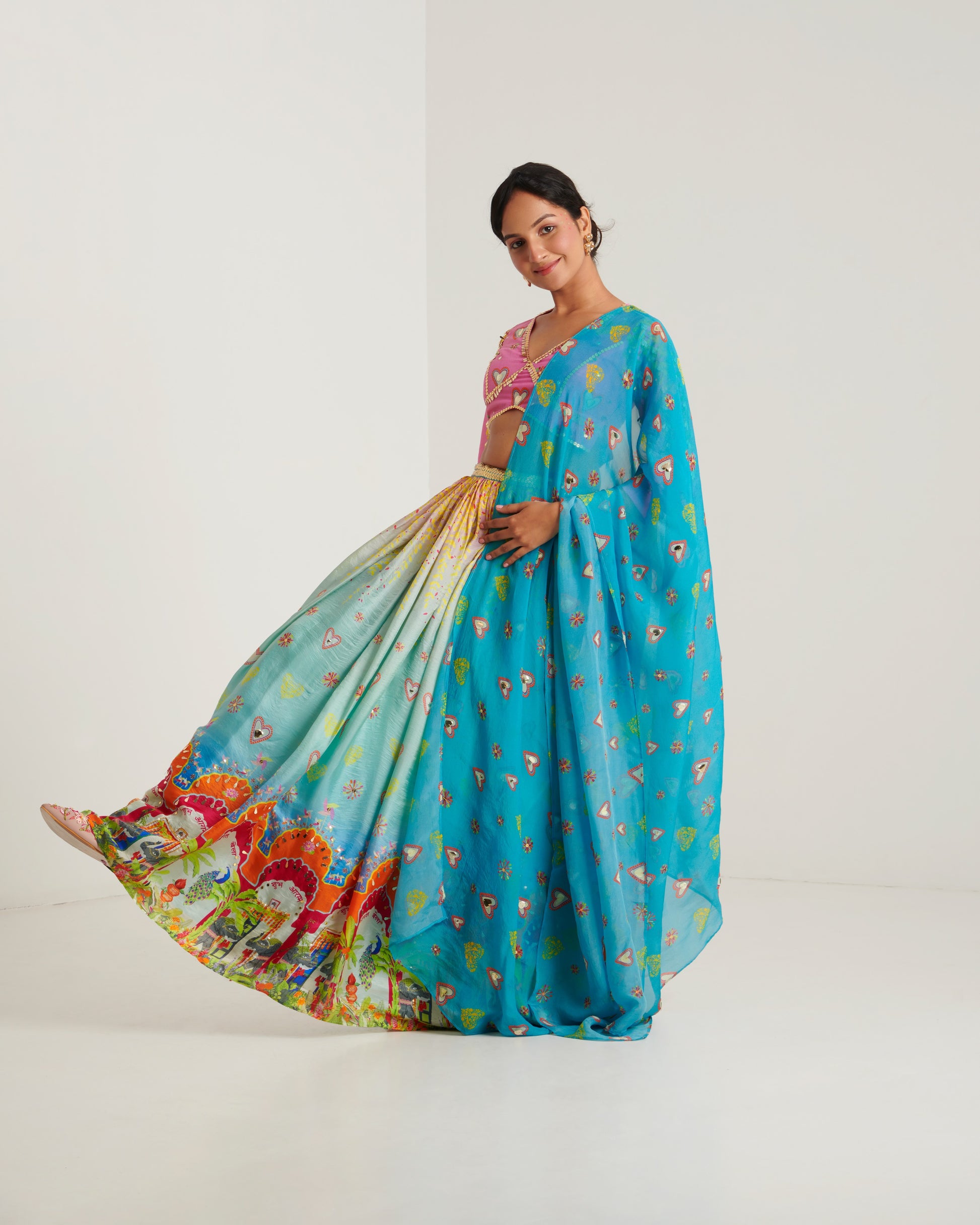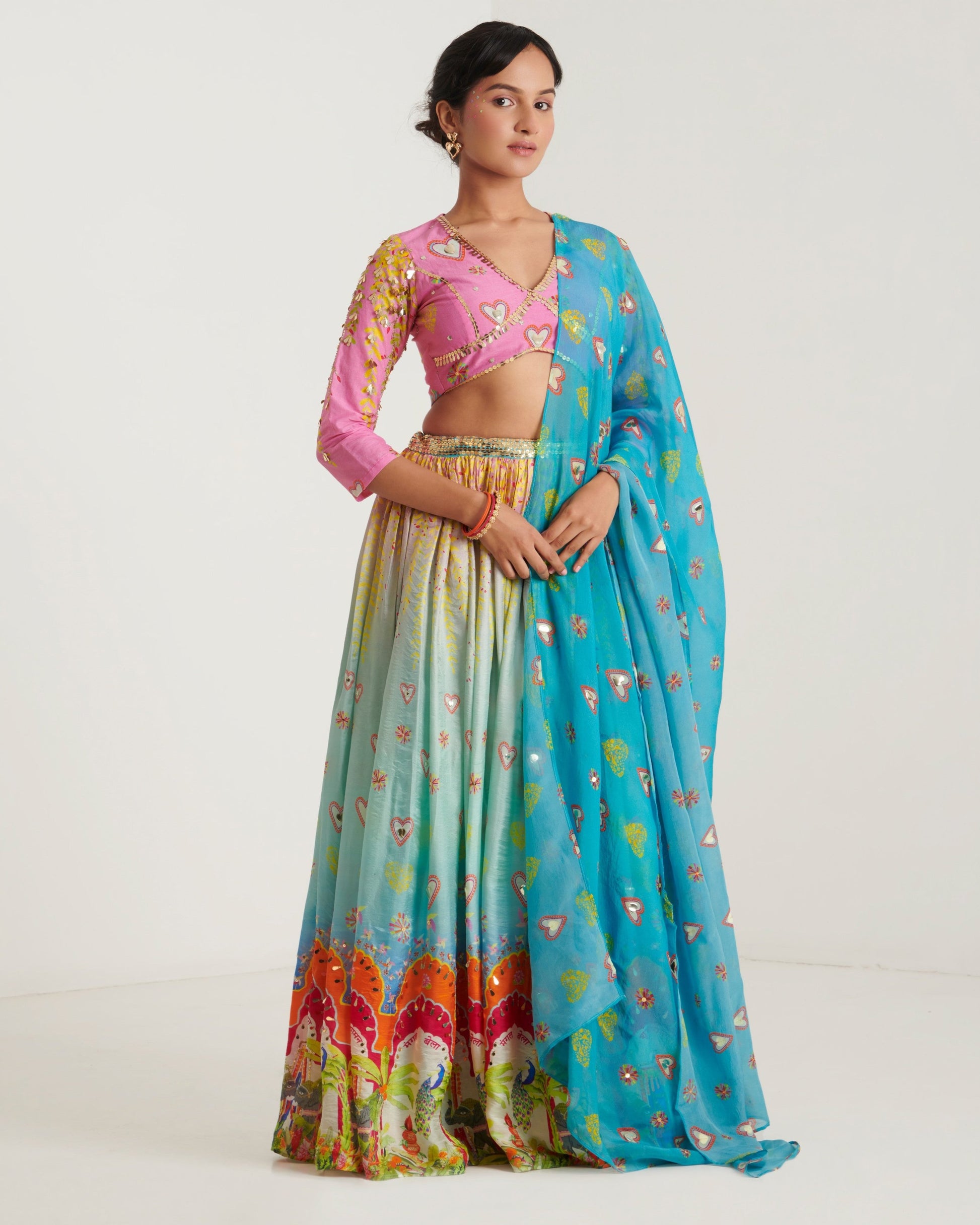 Our surya printed lehenga set is the gorgeous printed ensemble for all Indian festivities. A quirky lehenga inspired from celebration has all over hand embroidery highlighting comes with beautifully embroidered blouse and all over embroidered dupatta.