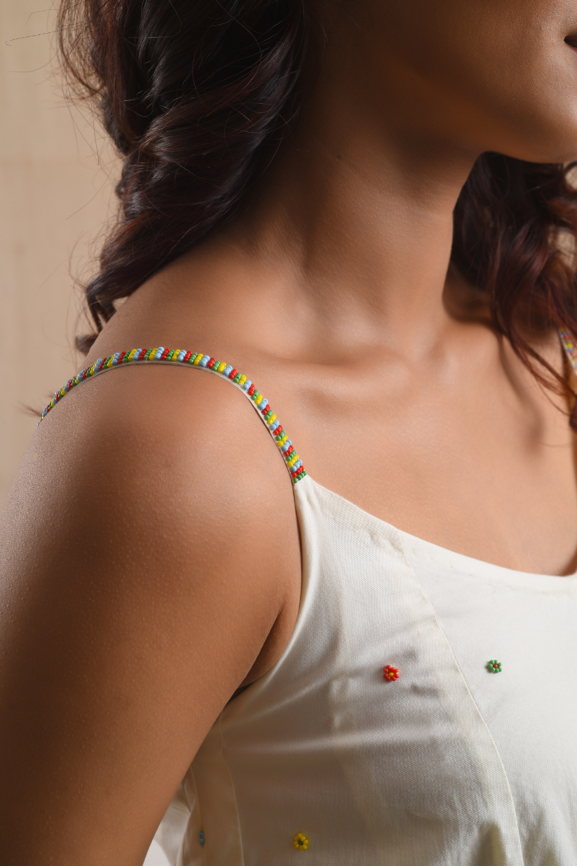 All over flower hand embroidery panel kurta with beats embroidery straps come with matching plazzo. Our cream kurta set is fuss-free and breathable silhouette for festive season. Handcrafted with love and care ,you can also wear it as a dress