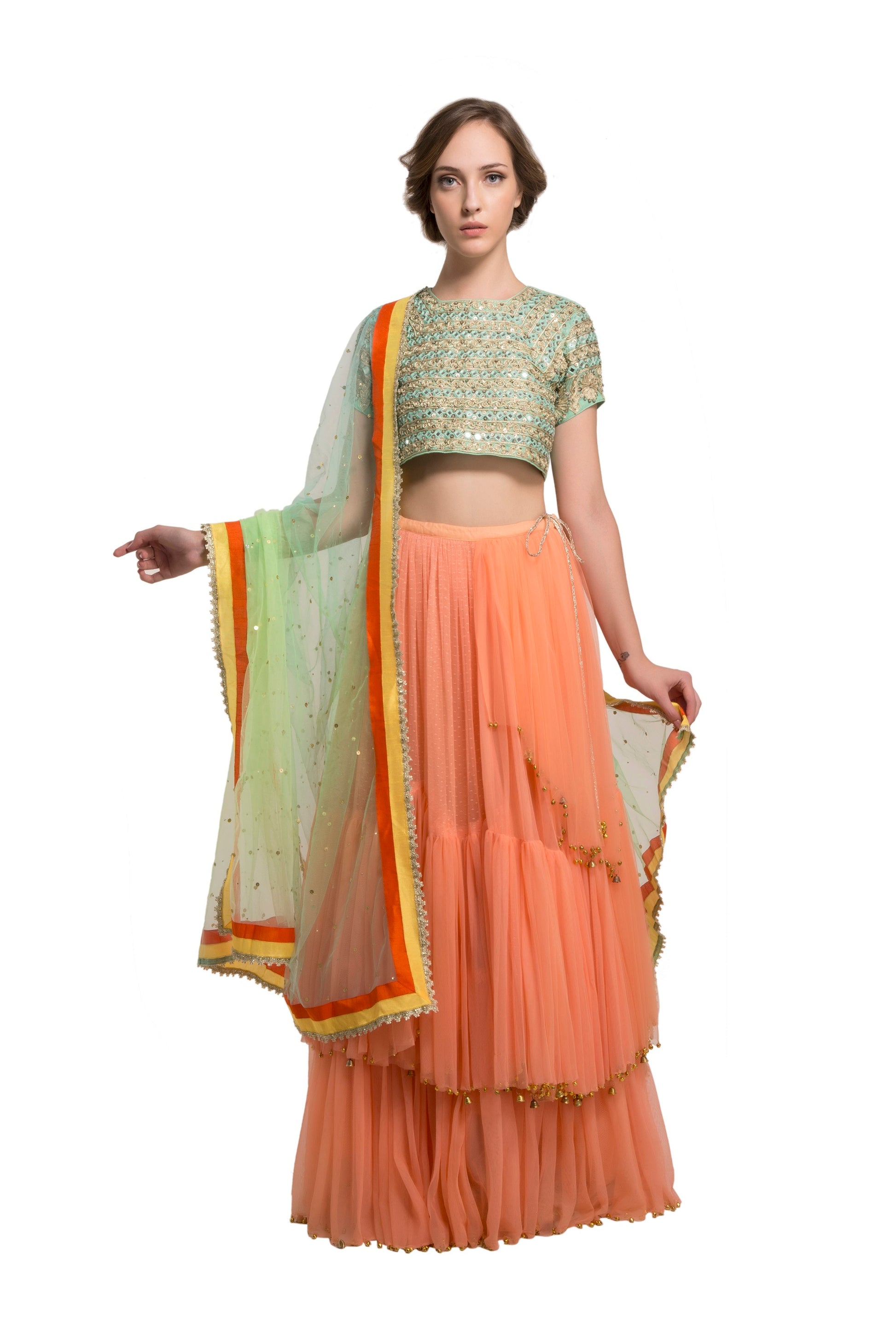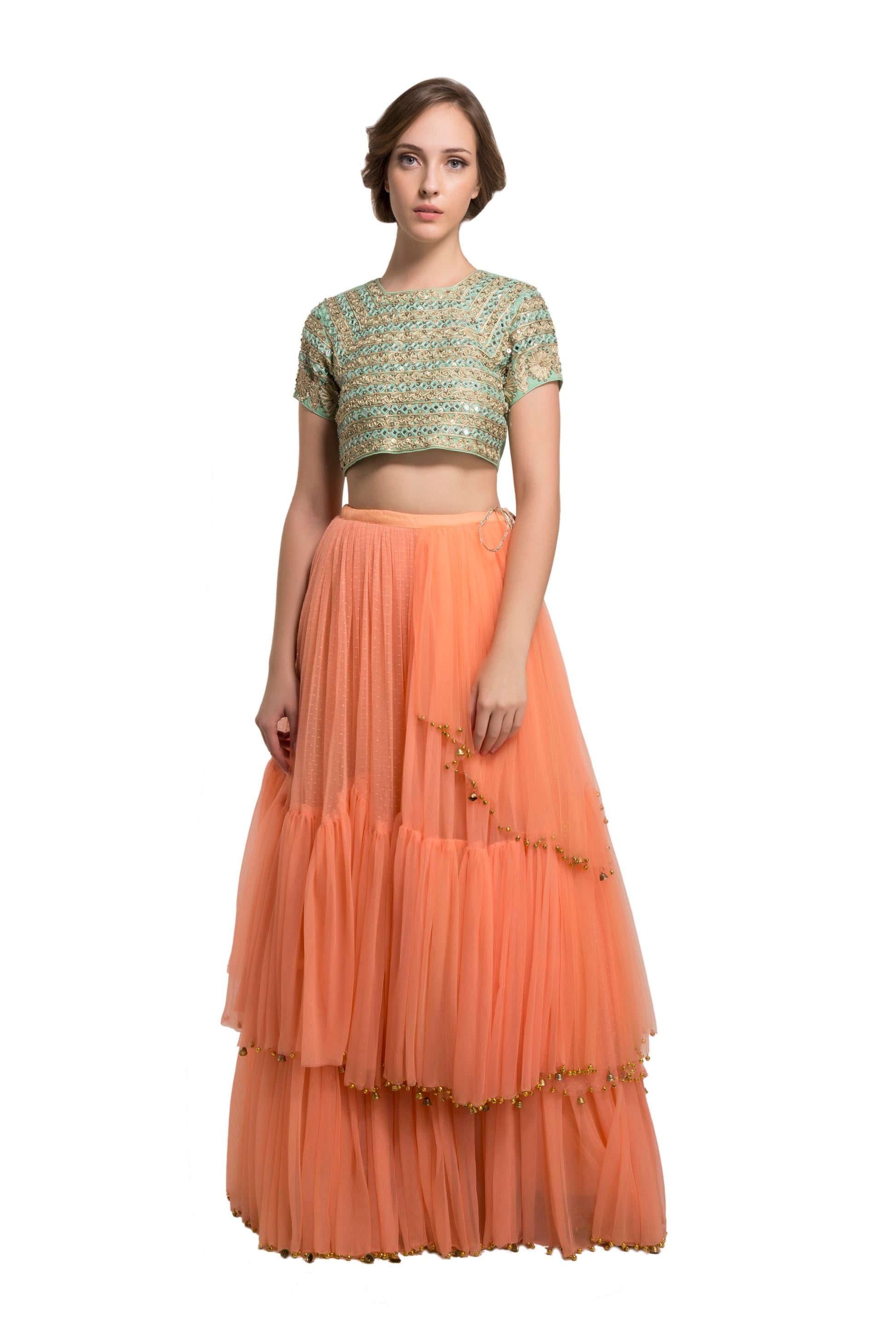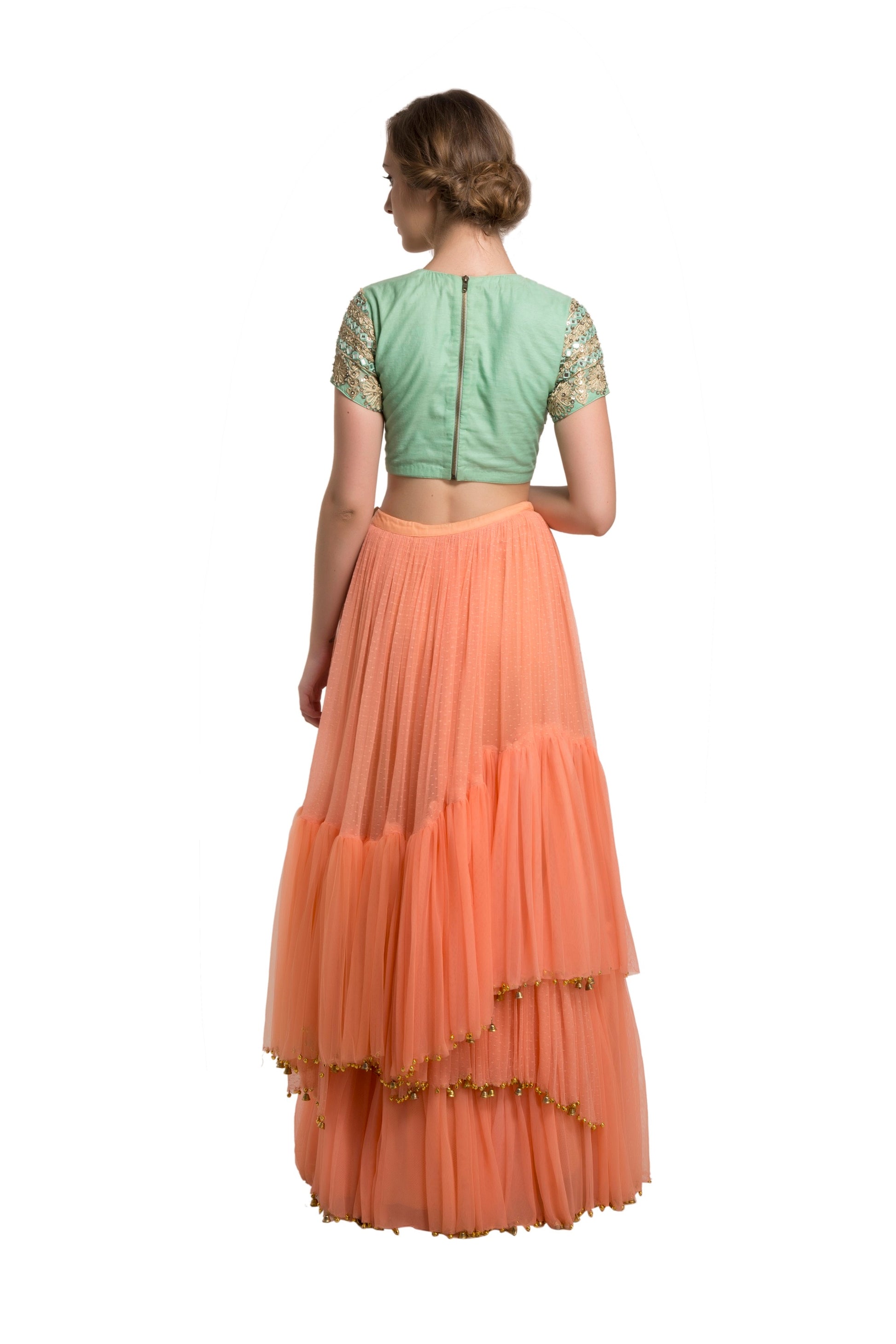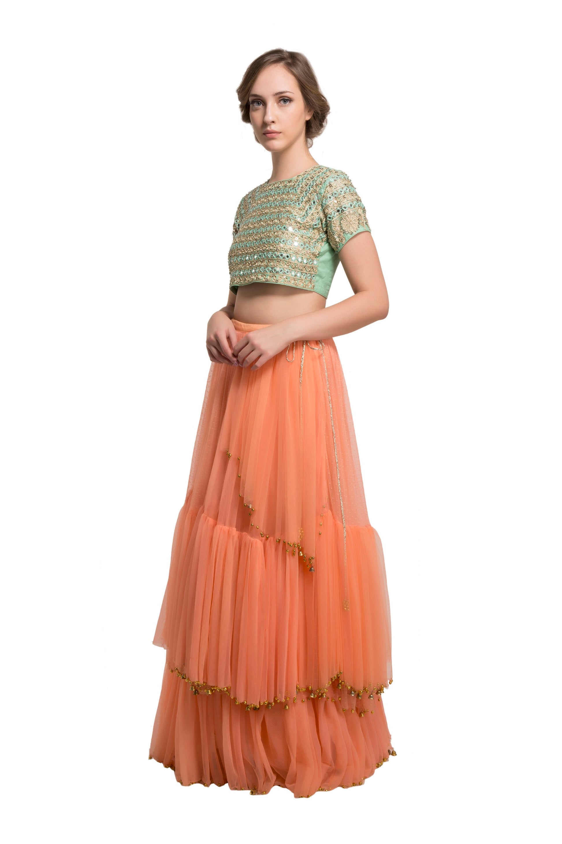 Peach tulle skirt with many panel having real ghungroo embellished at the edges. Crop top is hand-embroidered with dori, mirrors and threads with traditional technique.