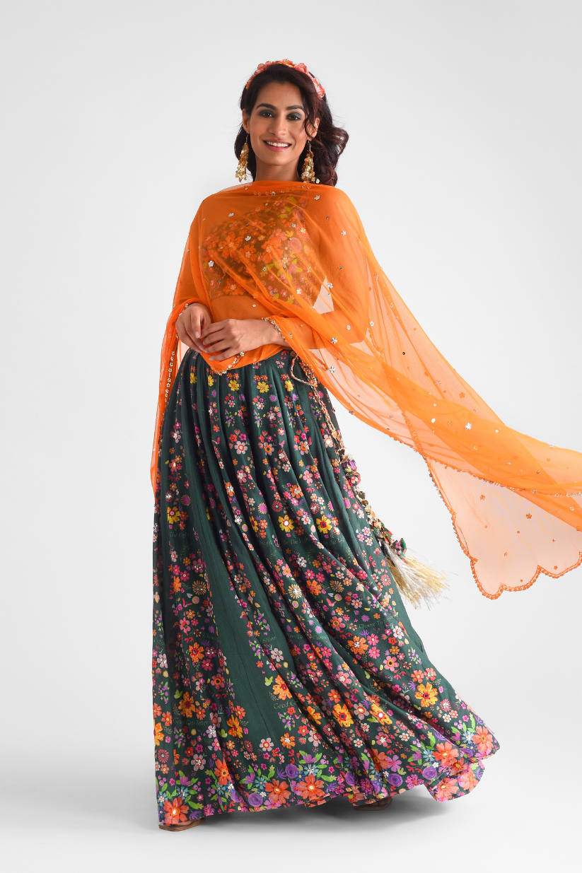 Our Green floral Lehanga is a dreamy outfit for haldi and mehandi function , Inspired from nature the florals are printed and highlighted with beautiful hand embroidery, it the super comfortable outfit to enjoy the wedding festivities