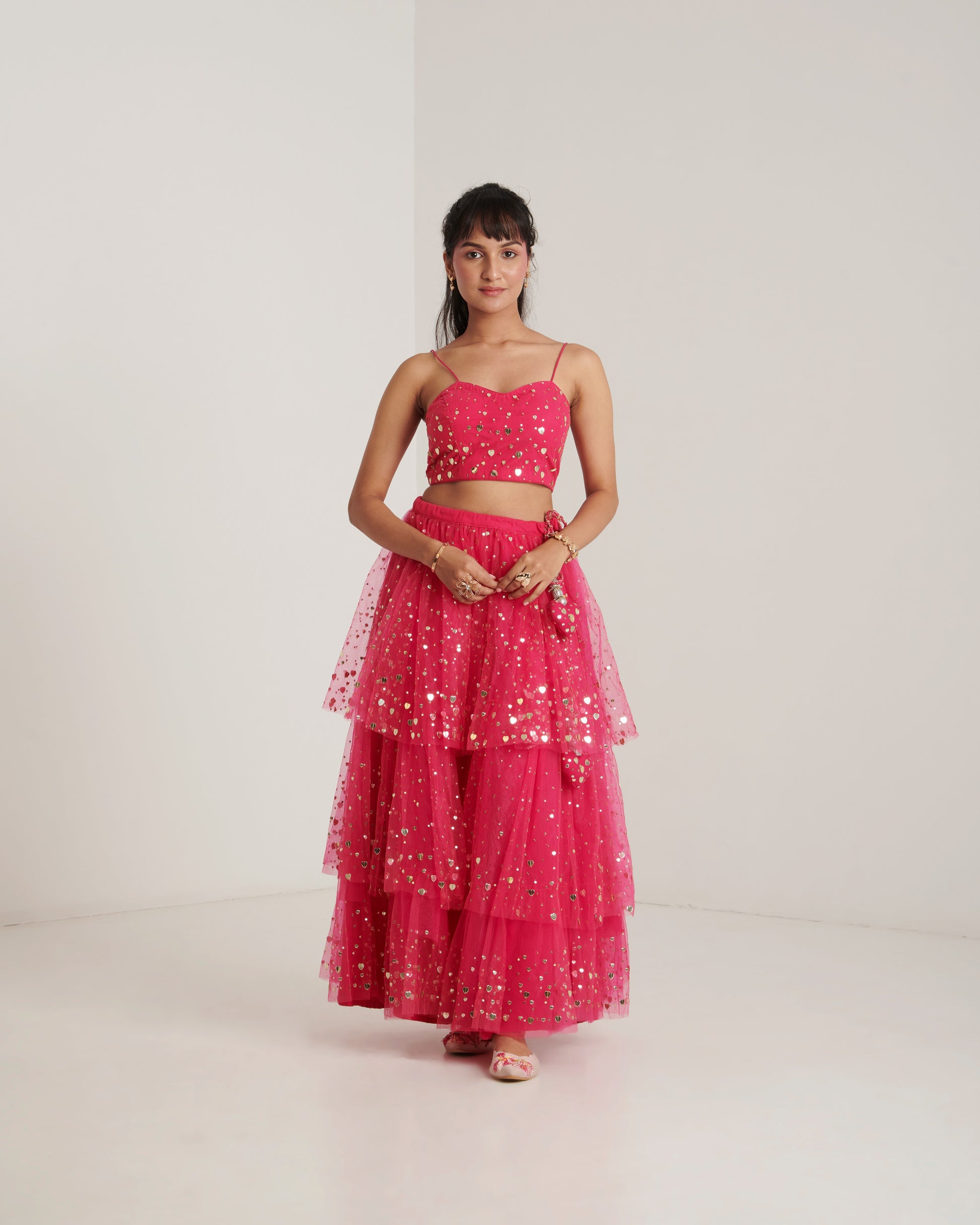 3 tier lehenga set. It's all over hand embroidered with heart shape sequin of different sizes. A beautiful ensemble for all the Indian festivities. It comes with embroidered matching blouse and all over hand embroidered dupatta.