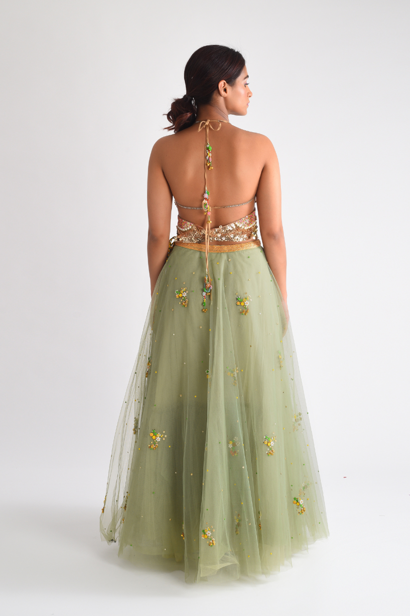 Pista green net lehanga all over embellished lehanga comes with fully hand embroidary with butterfly shape blouse.