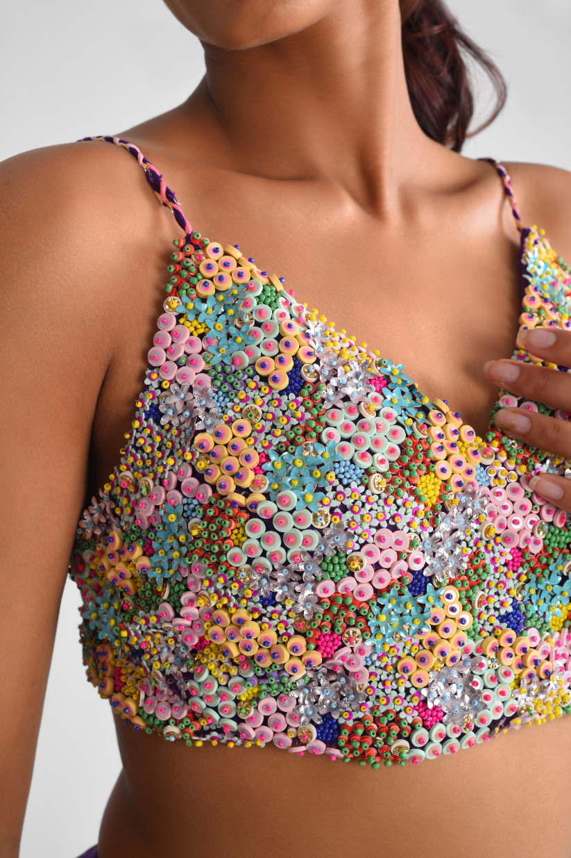 Carnival printed purple lehanga embellished with all over super cute hand embroidery comes with fully embroidery wrap blouse and matching embroidery dupatta
