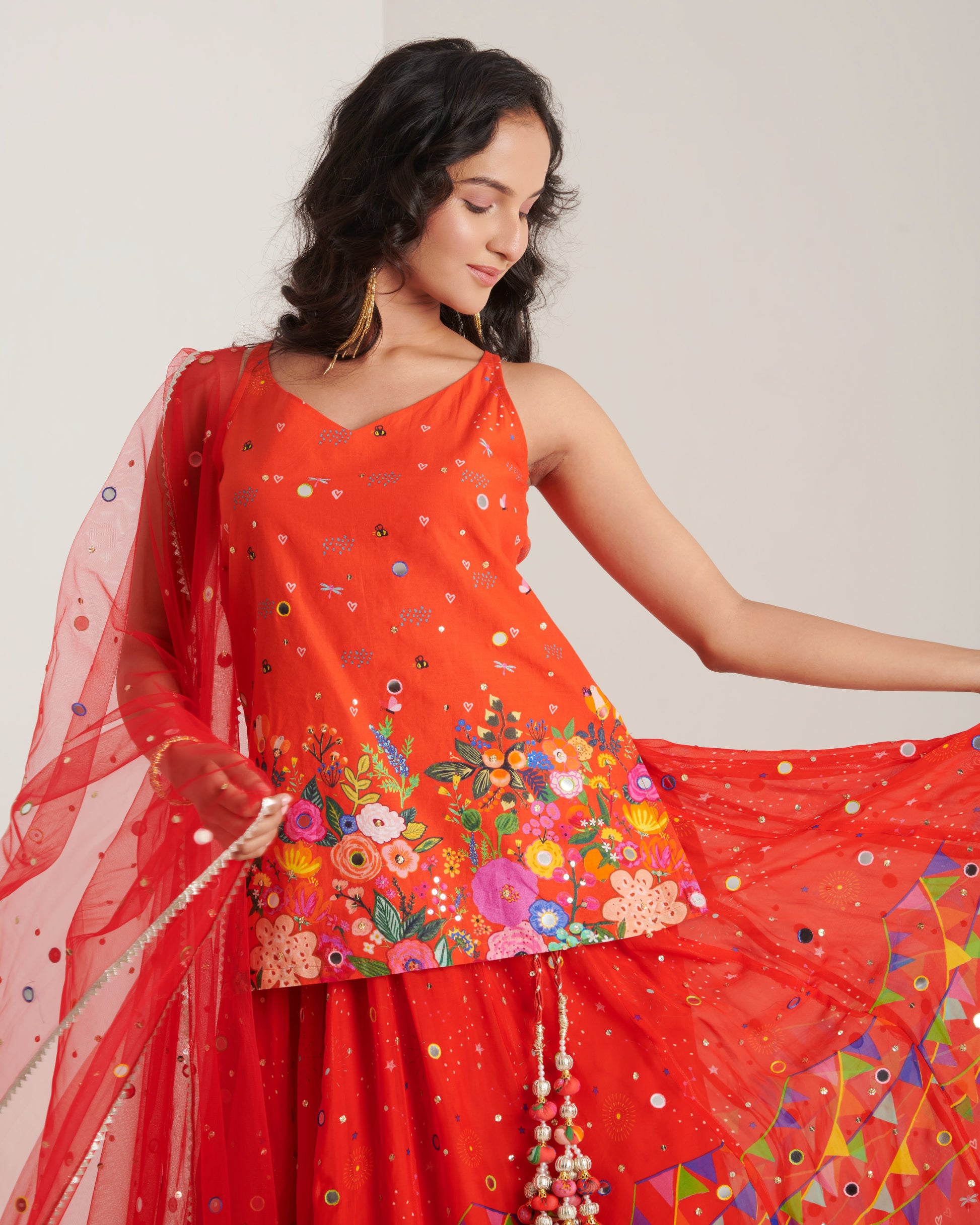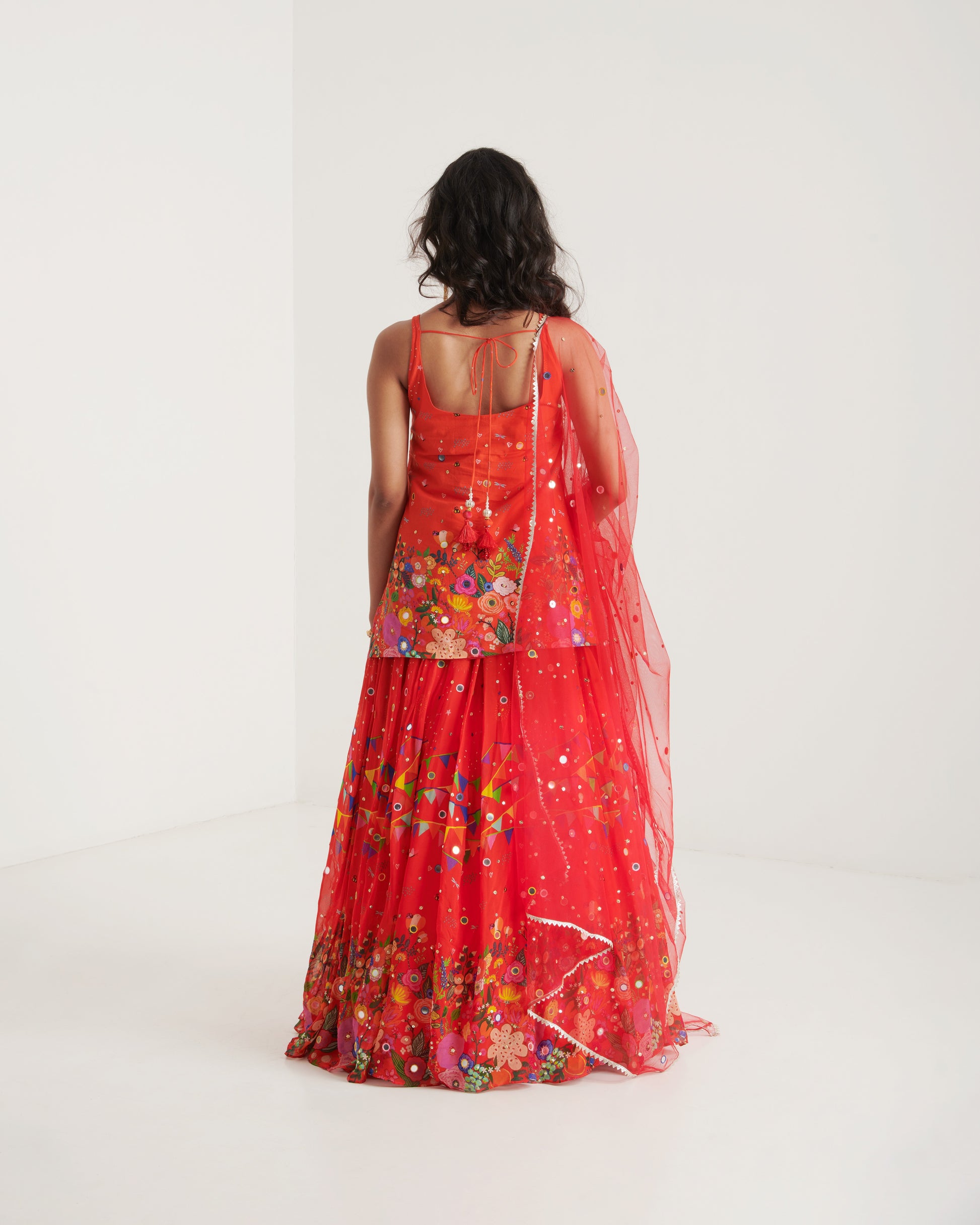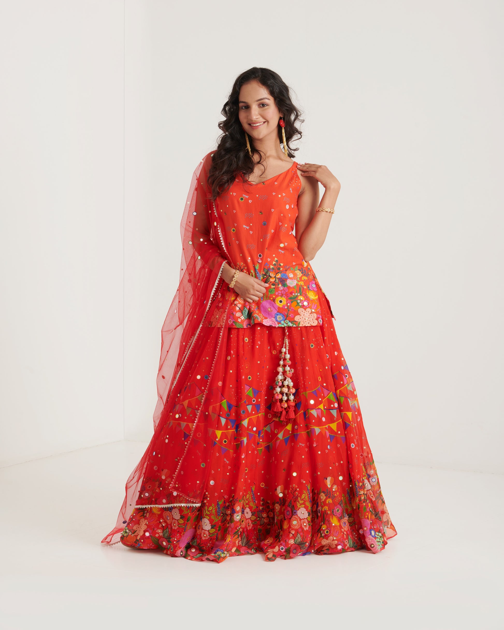 Carnival inspired beautiful floral printed lehenga set. It's all over hand embroidered with mirrors and colourful sequin to make it a perfect ensemble for your sangeet or mehandi. It comes with matching kurti and all over hand embroidered dupatta.