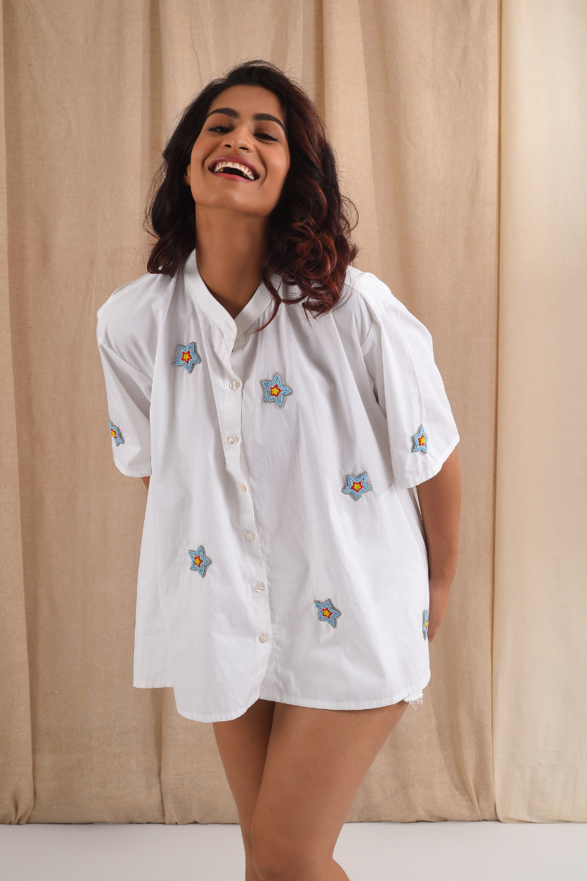 The white cambric cotton shirt has hand embroidered 3-d bead work in shape of stars all over.