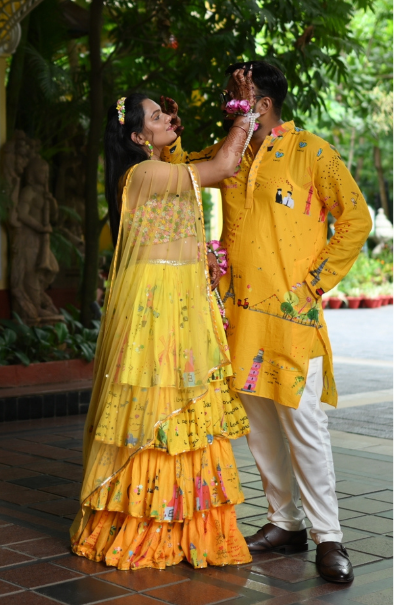 each panel of lehenga is of different color print and its all over highlighted with hand embroidery with colorful gota on edges
